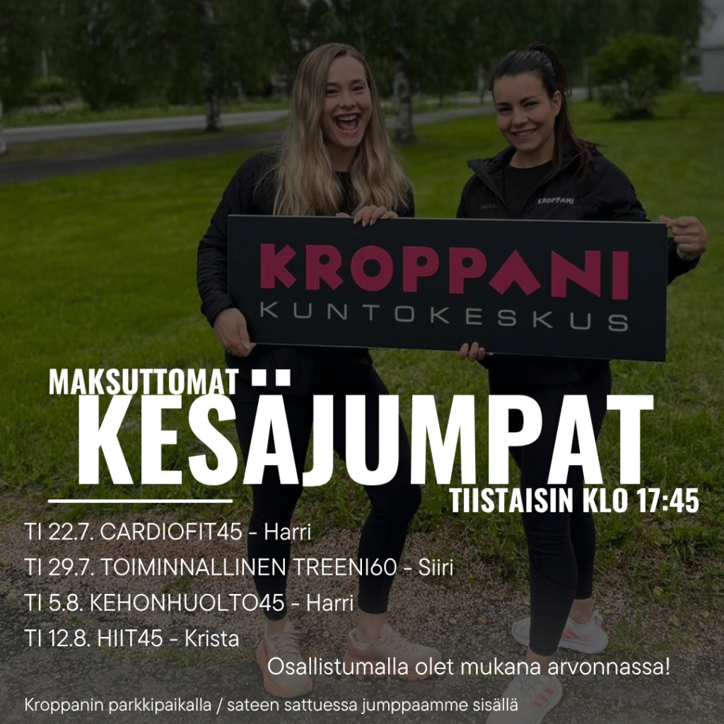 Tuntivalikoima on laaja ja toivomme jokaisen kokeilevan rohkeasti uusiakin lajeja! Meille kaikki ovat tervetulleita, sillä Kroppanin kesäjumpat ovat kaikille maksuttomia.